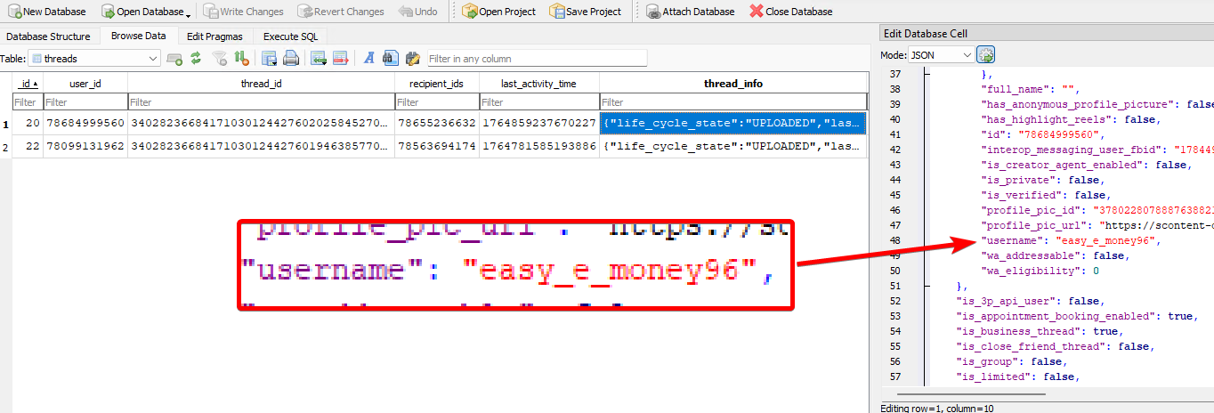 Open in DB Browser to see the blob information, and head to the threads table where you can see information about each conversation.