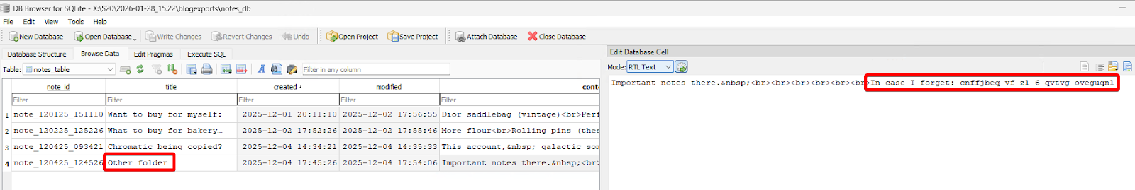 At this point you can probably guess the answer is the user’s birthday, but the real smoking gun is inside the notes application’s database, at /userdata/data/com.notes.todolist.notebook.checklist.notepad.android/databases/notes_db: