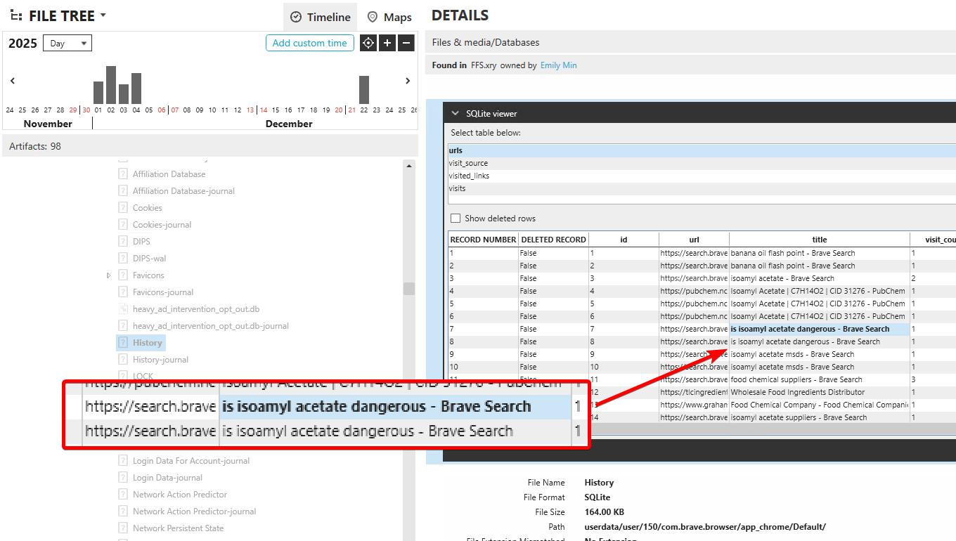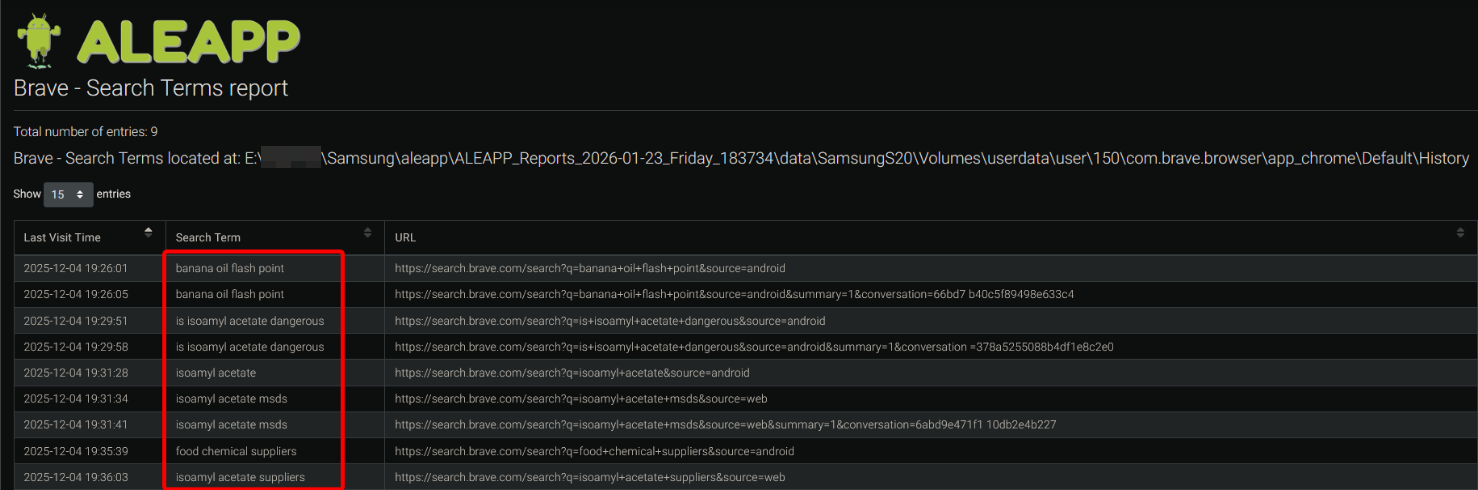 Afterwards, she makes searches about Banana oil, and later Isoamyl Acetate (commonly used artificial banana flavoring) in Brave inside the secure folder.