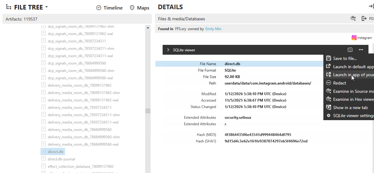 Find the Instagram app’s direct.db at /userdata/data/com.instagram.android/databases/direct.db to locate the DM for each account:
