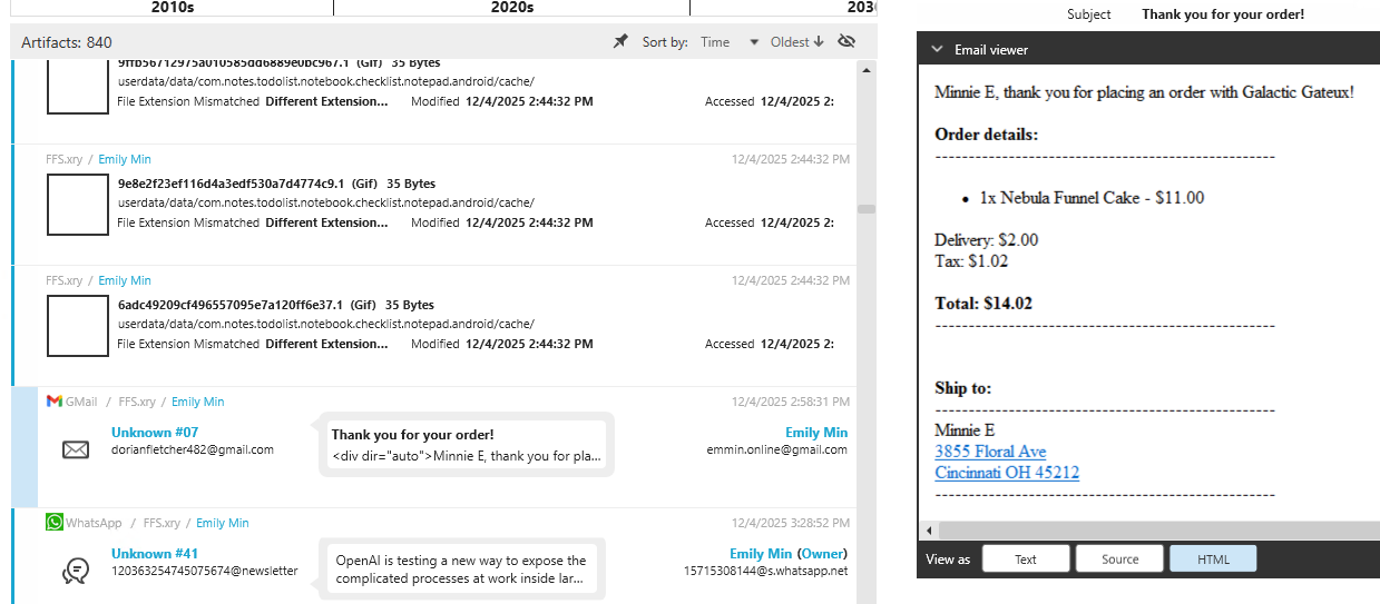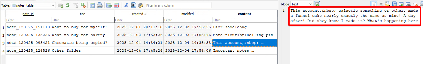 Just before, there is some activity in a 3rd-party notes app. Looking at the database for that app (com.notes.todoist.notebook.checklist.notepad.android), at /userdata/data/com.notes.todolist.notebook.checklist.notepad.android/databases/notes_db, we can see a note saying that the “galactic” account made a funnel cake nearly exactly the same as hers (rainbow funnel cake) just one day after. Afterwards, there is a note about important information being in the “Other folder”
