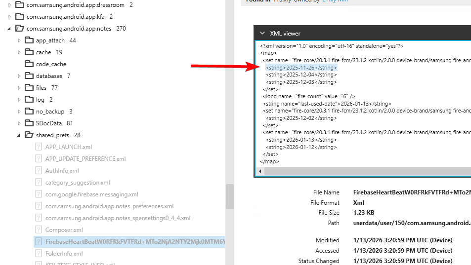 Hidden notetaking app refers to the Samsung Notes app in the secure folder. You can find the day it was first opened by checking the FirebaseHeartBeat….xml file, and finding the earliest date: