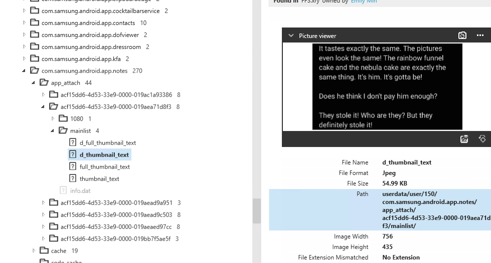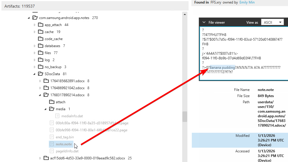 In the FFS image we can see that the user has a note with the text “Banana pudding” inside the Samsung Notes app in the secure folder.