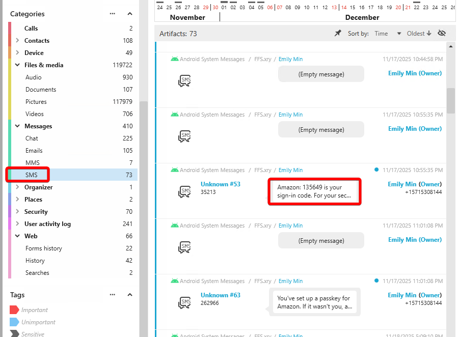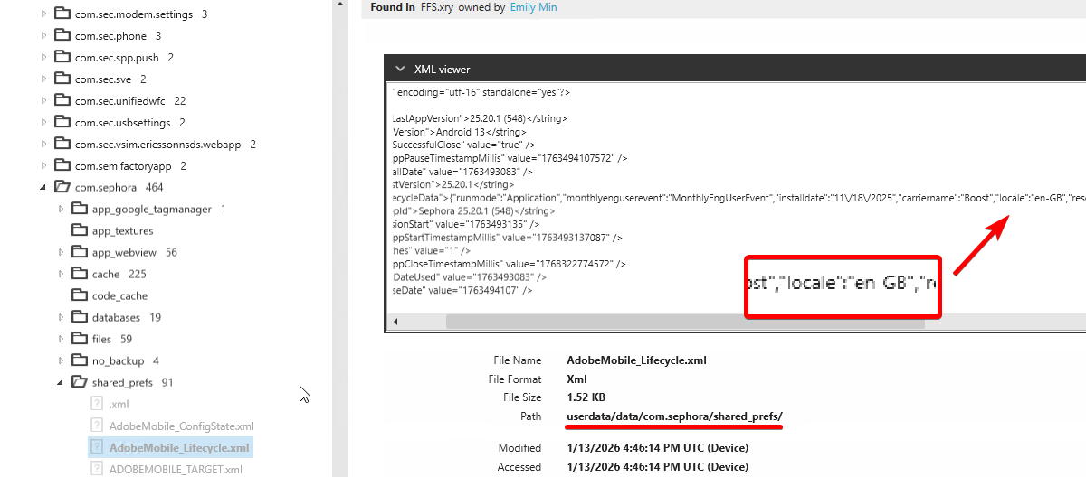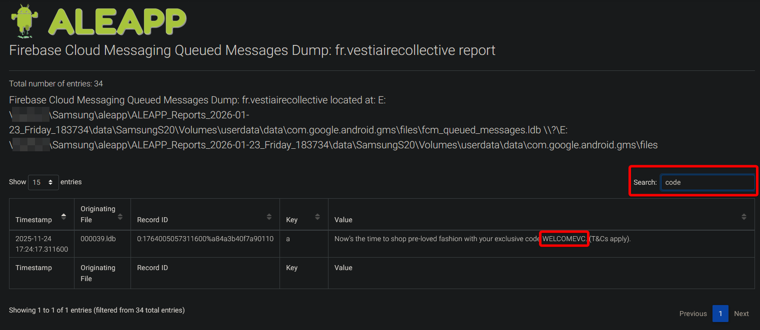 Looking though the apps installed on Emily’s phone, there is one called “Vestiare Collective” which is for reselling pre-owned fashion (including antiques). In ALEAPP you can view the Firebase Cloud Messages for the app, and filter for “code”, where you will see the “WELCOMEVC” code is offered to the user through a notification.