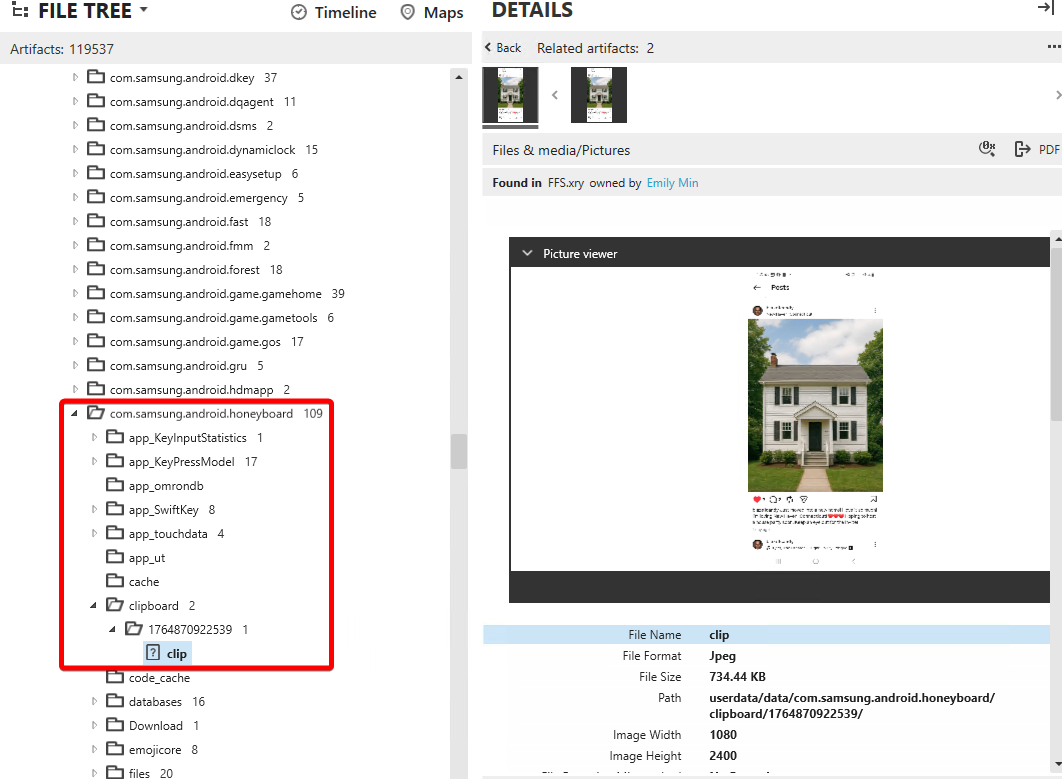 Look inside the honeyboard’s clipboard storage folder located at /userdata/data/com.samsung.android.honeyboard/clipboard/.