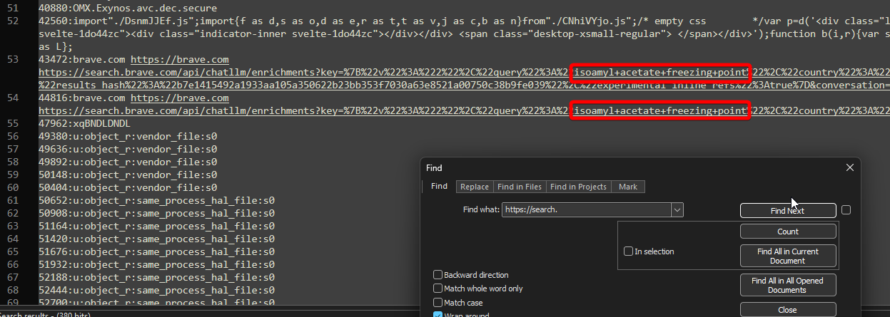 Looking for these properties that didn’t show up in XAMN or ALEAPP, you can search for “https://search.” to find all searches (Google, Brave, Yahoo, and many other search engines all use search.[website].com format):