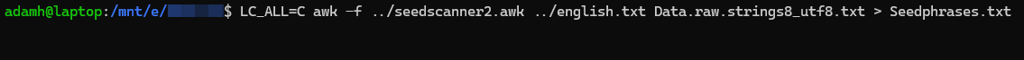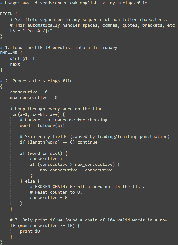 Create an awk script to take this and your strings file to filter for potential seed phrases.