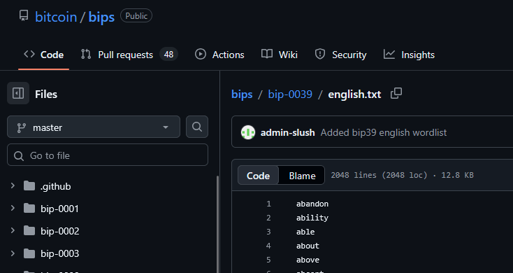 First, we want to make sure that we have captured a list of all the potential seed phrases in the RAM image. To do this, first download the Bitcoin BIP-39 wordlist for seed phrases. It is 2048 words long.