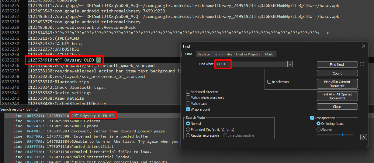 If you search for the string “OLED ” (with the space) you should come across it pretty quickly. The reason this shows up in RAM is because it renders for the user when inside the Android settings app, when scanning for advertising Bluetooth devices.