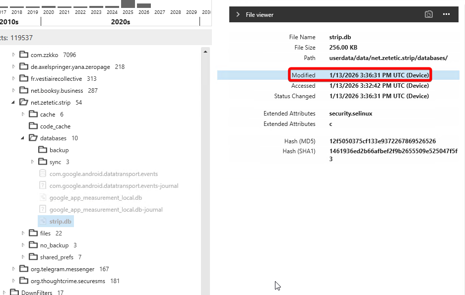Looking at the question again, if the seed phrase was saved, it was likely saved to the password manager. If we investigate the DB for the Codebook Password Manager app, we can see that the strip.db is encrypted, but was last modified at the exact time that is associated with the seed phrase.
