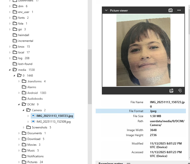 There are a couple places where there are pictures of Emily, but an original photo taken on the phone would be inside the [user id]/DCIM/Camera/ directory. If we find other copies, the hash may be different as lots of data tends to get removed when the phone saves copies in other places and the resolution changes, so it’s crucial to find the original one. Inside this directory on the phone, there are two images. One has a picture of Emily and one is a logo for Chromatic Confections.