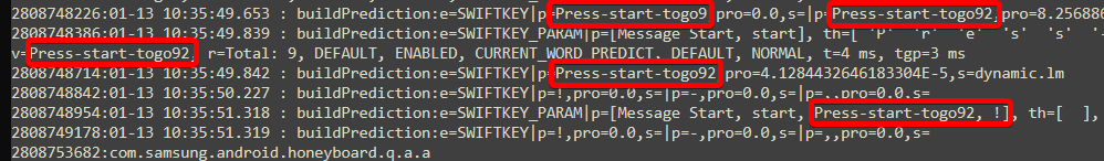 This is much easier to solve if you have finished the last question. If we search for this password string, there are a lot of hits that start with “buildPrediction:e=SWIFTKEY”. This is actually the RAM data from the com.samsung.android.honeyboard app. Fortunately, it has timestamps that mark the time the user typed the characters: