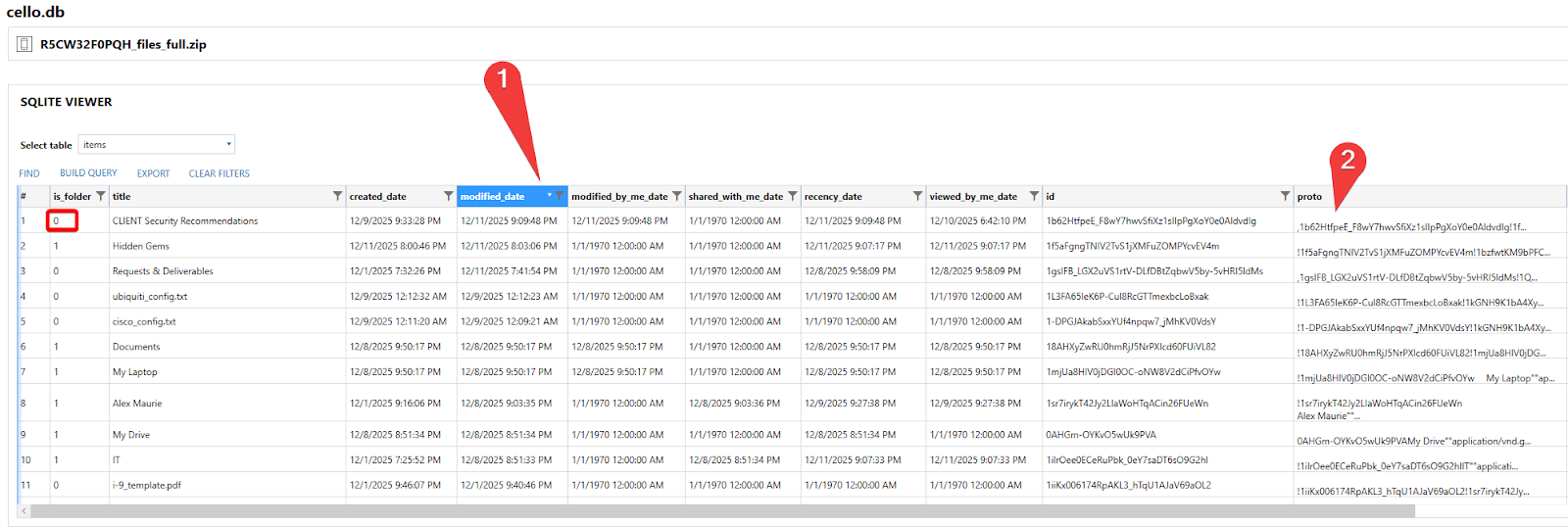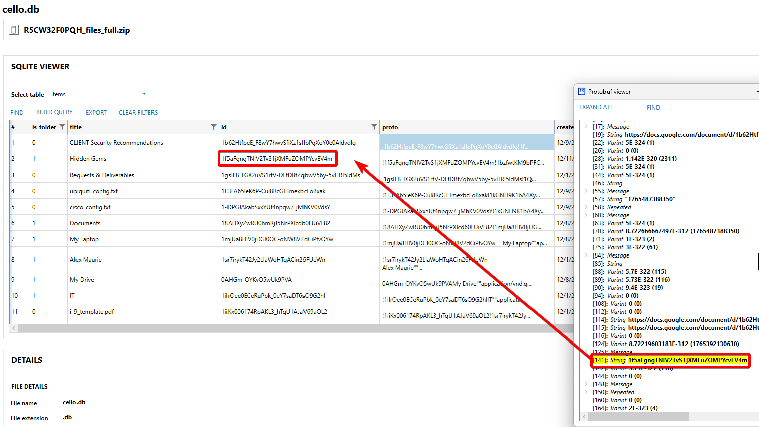 There is a protobuf that contains the ID of the parent folder. We can see that id in entry 2 “Hidden Gems” in the id column. The screenshot below has reordered the columns showing both the protobuf from entry 1 “CLIENT Security Recommendation” and the corresponding entry in the “id” column of entry 2. “Hidden Gems” is in the “Clients” folder.