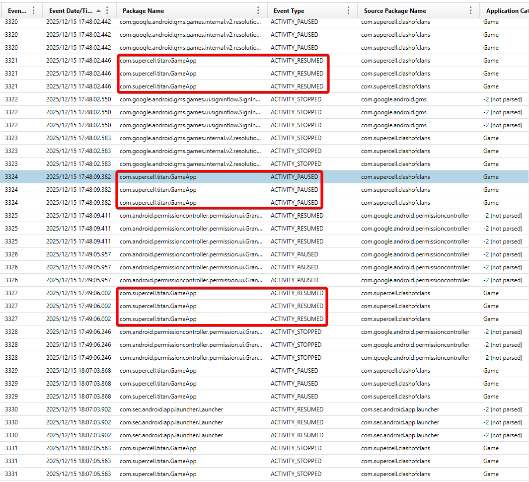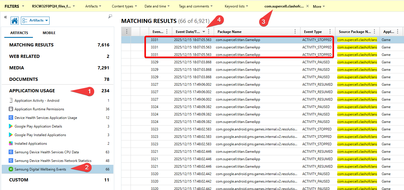 Axiom parses the Samsung Digital Wellbeing database, which tracks application launches, closes, and background/foreground events. Filter by the app ID of Clash of Clans (com.supercell.clashofclans) and reverse sort by date.