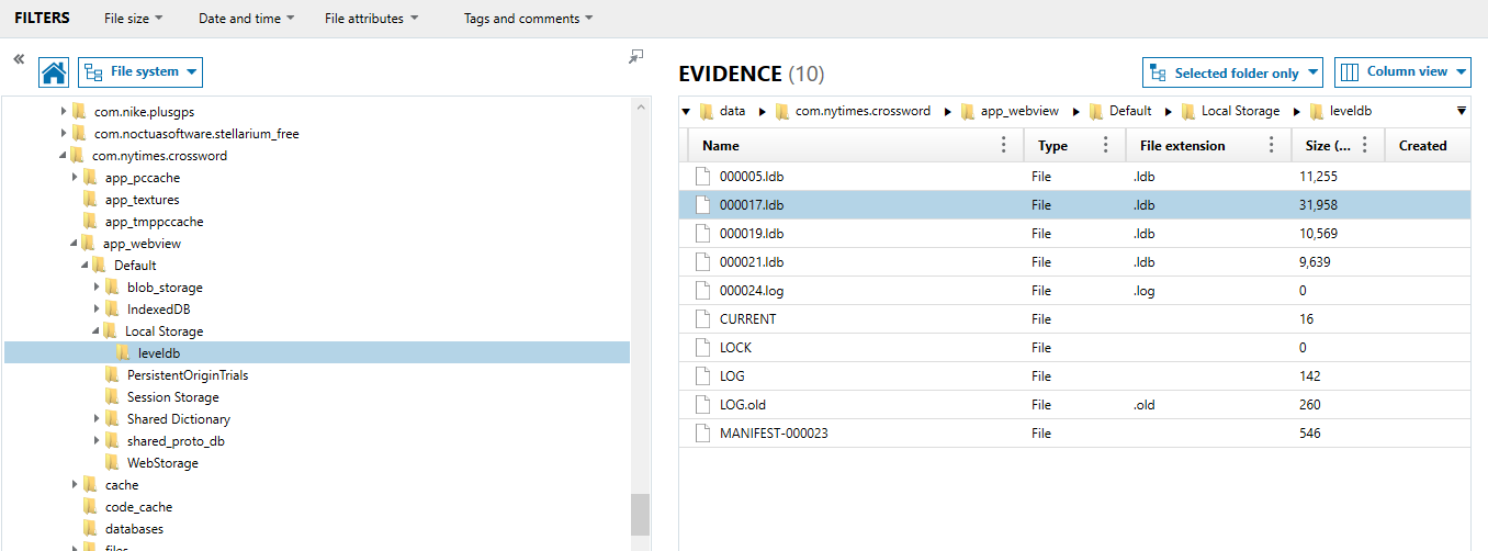 Navigate to the folder for the NYT Games app, and extract the Local Storage LDB from the app_webview folder: