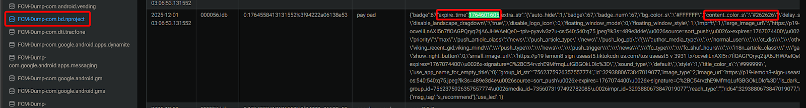 This one is a bit tricky to find, but it is easier if you use ALEAPP to view FCM-Dump LDB databases. For the app “com.bd.nproject” (Lemon8) we can see there is an expire_time inside a large JSON object every few rows. By searching for the Unix Seconds format of the timestamp in the question, we can see the hex code for “content_color_s”.