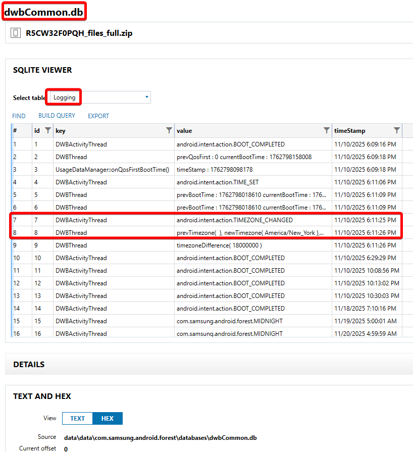 The purpose of this question is to get people looking at unsupported artifacts. In this case, Samsung Digital Wellbeing seems like something to skip over as it has parsers as of now, but not all the tables within this database are parsed properly, there are still some outliers. One of which is this “Logging” table. The logging table has timestamped records of changes to the active timezone. Two entries show up here that represent changes to the timezone, one second apart. Both of them are valid flags.