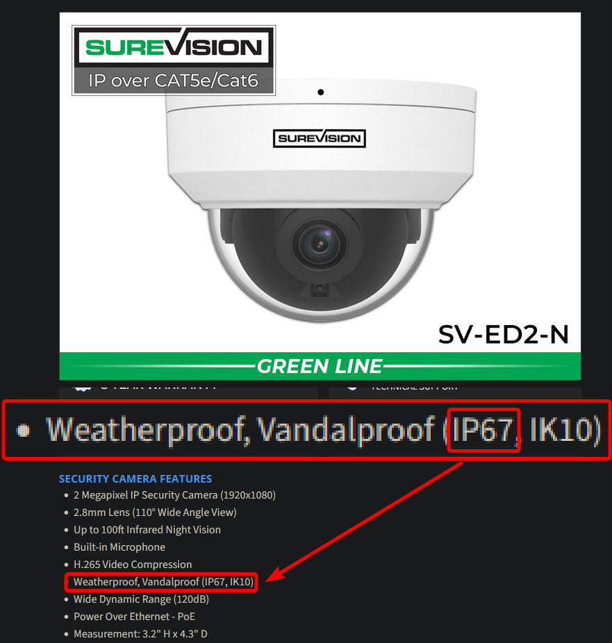 What is the Ingress rating of the security camera that supports night vision?