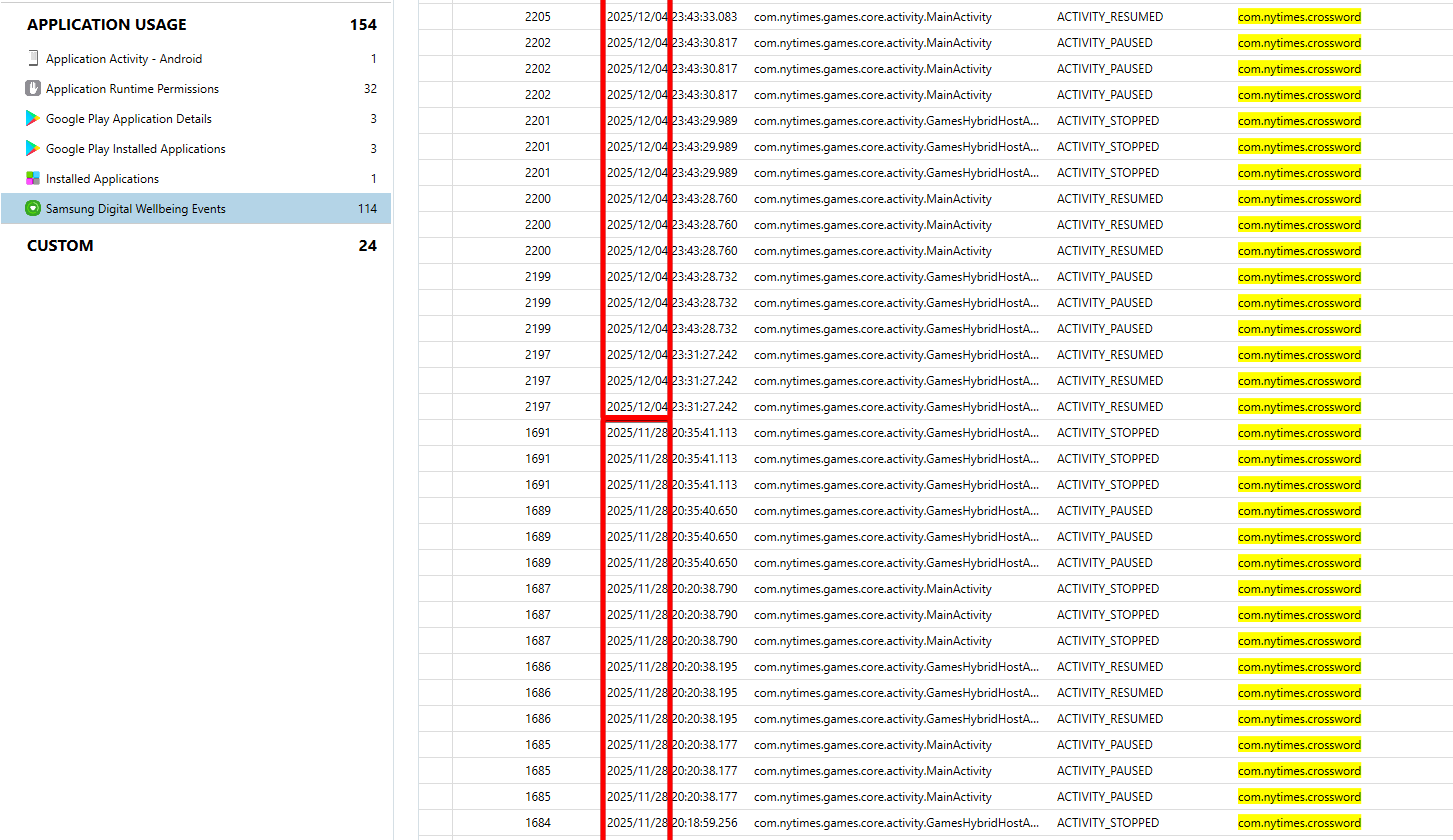 The NYT Games app has Wordle in it. Use a global filter for com.nytimes.crossword to see related artifacts. In the Samsung Digital Wellbeing DB artifact(\data\data\com.samsung.android.forest\databases\dwbCommon.db), We can see that the user spent time on the app on 2025-11-28 and 2025-12-04.