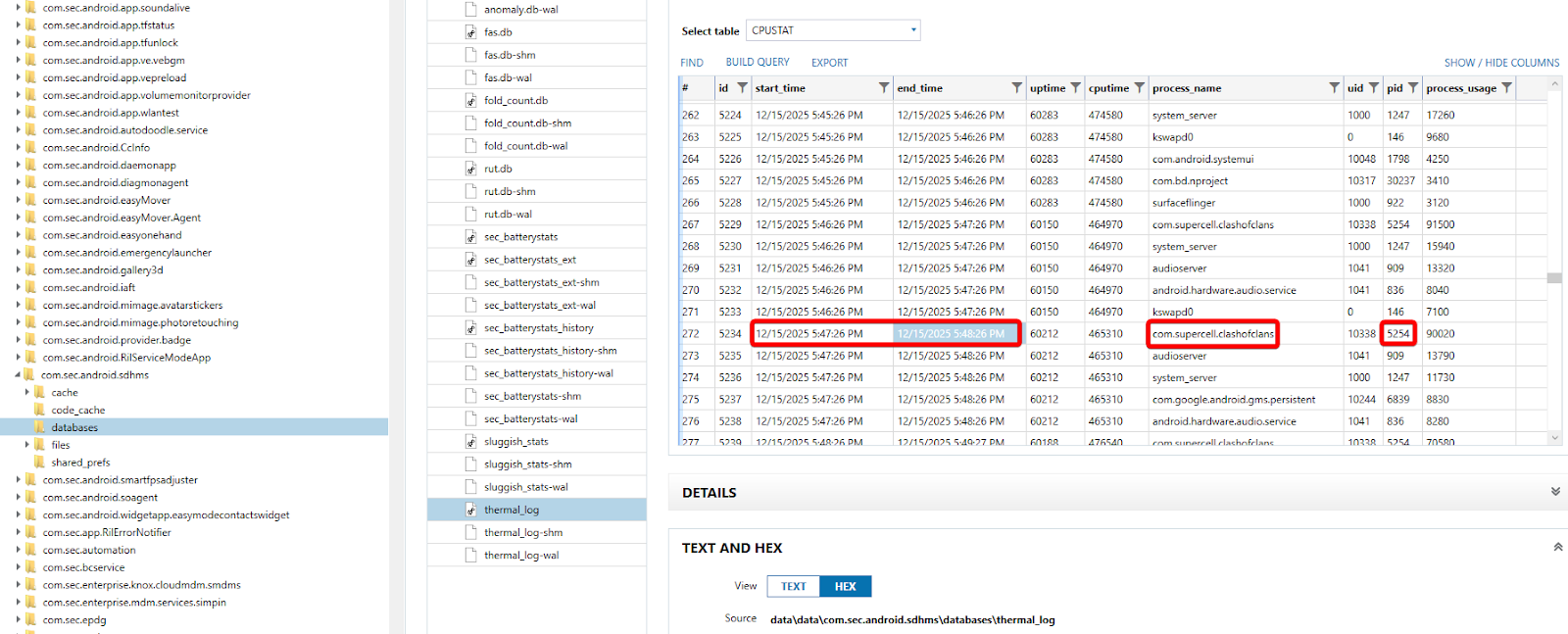 Second, use the CPUSTAT table in the \data\data\com.sec.android.sdhms\databases\thermal_log database in the com.sec.android.sdhms package to find the PID of the app there at that time.