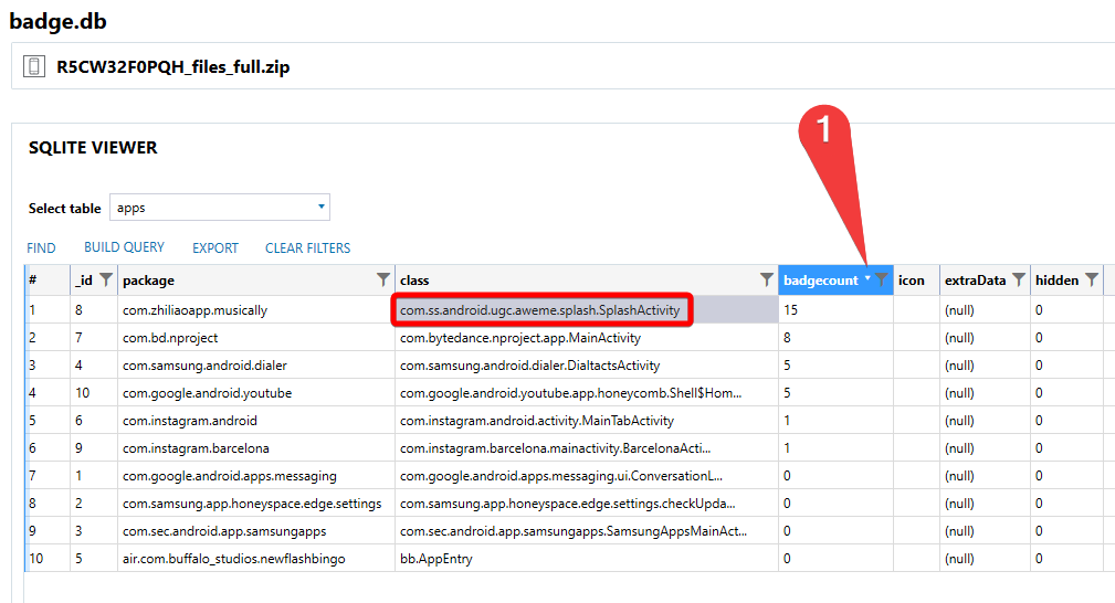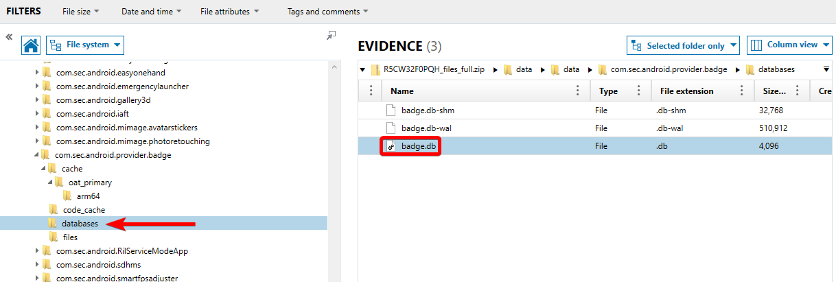 Badges are the small icons (usually red or orange circles with a number) that appear on the corner of app icons to notify you of unread messages, missed calls, or pending alerts. On Samsung phones this is done with the Samsung Badge Provider. The package name for this is com.sec.android.providers.badge. Get to the folder and locate the only database, at: