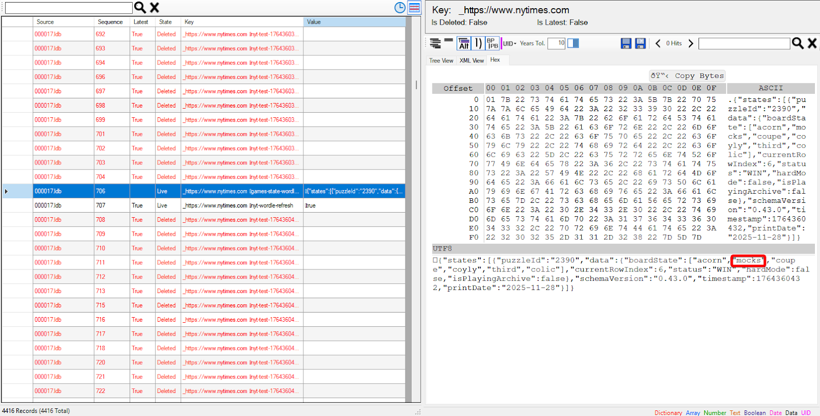 Scroll down far enough and you can eventually see an entry containing the state of the wordle puzzle as the user was playing, containing the guesses, timestamp, status, and more.