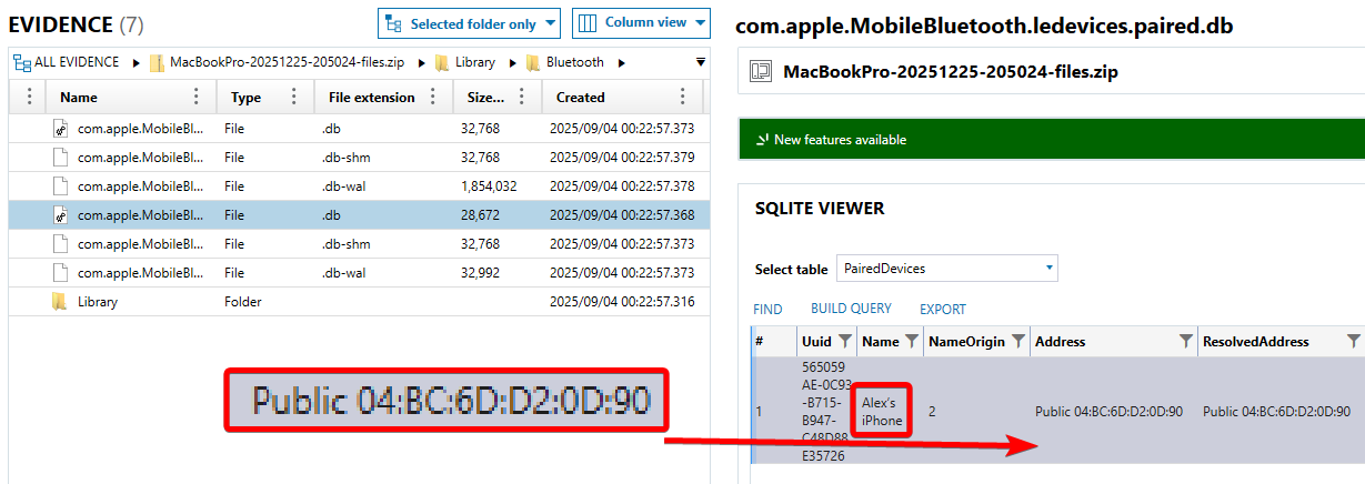 Using an SQLite database viewer, open the "com.apple.MobileBluetooth.ledevices.paired.db" database, and under the "PairedDevices" table, retrieve the "Address" field of "Alex's iPhone". Also appears within converted unified logs.