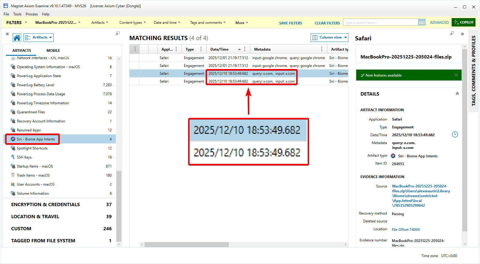 In Axiom Examine, under the "Operating System" and "Siri - Biome App Intents" artifact filter, a query for "x.com" can be found. This data can be found in the filesystem at:
