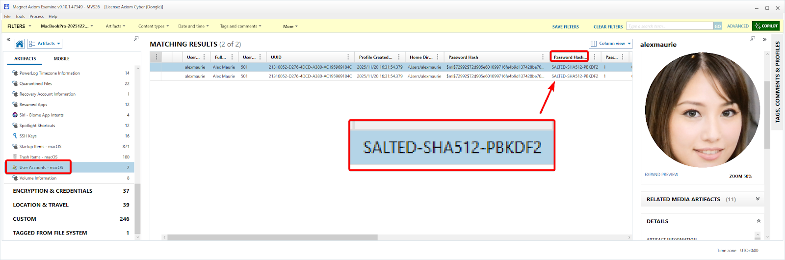 In Axiom Examine, under the "Operating System" and "User Accounts - macOS" artifact filter, you can find the password hashing algorithm in the details section of the Alex Maurie account. This info can be found in the filesystem at: