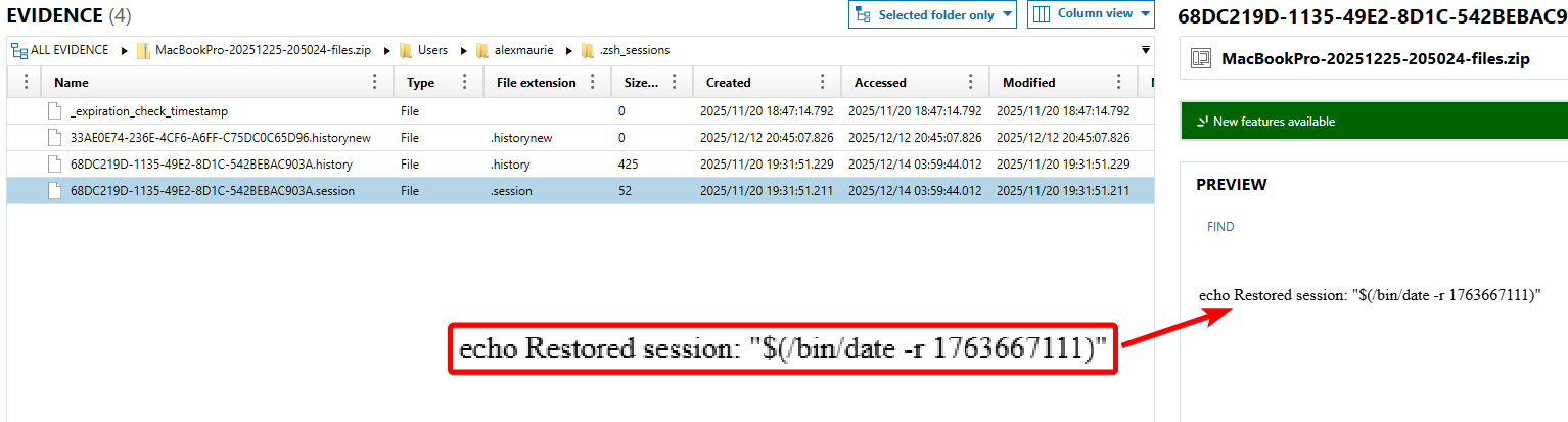 In the ".zsh_sessions" directory under the user’s home folder, find the ".session" file with an echo message stating that a session was restored at the time "1763667111". The UUID is contained within the filename.