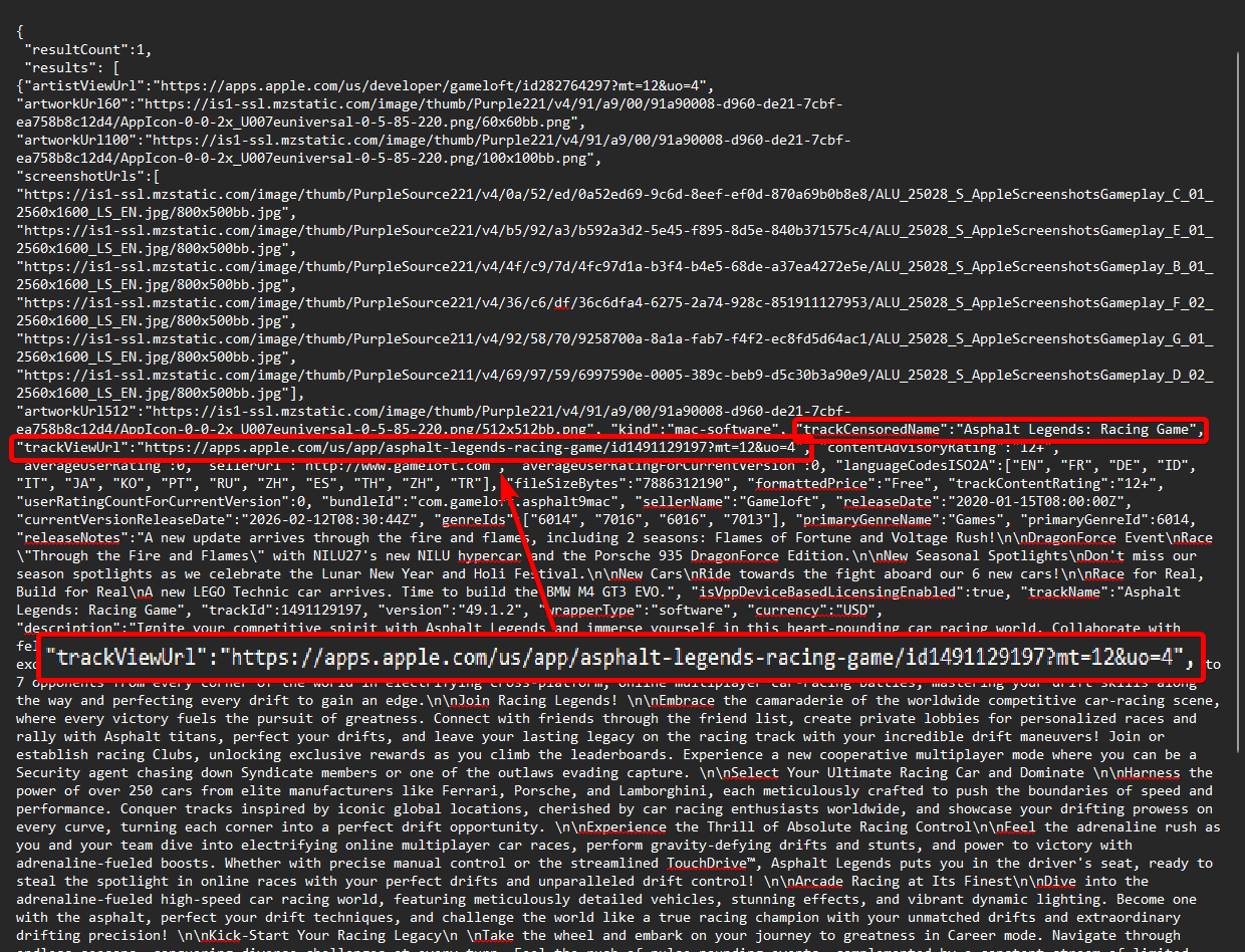 Convert this bundle ID to the real name by visiting “https://itunes.apple.com/lookup?bundleId=com.gameloft.asphalt9mac”, and ope the 1.txt file you will receive, the trackViewUrl is the app store URL.
