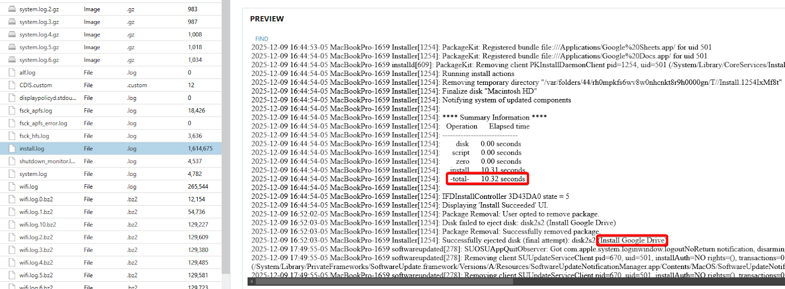 Find the 3rd-party cloud storage app, Google Drive for Mac, and then go to the install log located at “private\var\log\install.log”. It has a summary of how long an install took. Take the "-total-" number and use it as the flag.