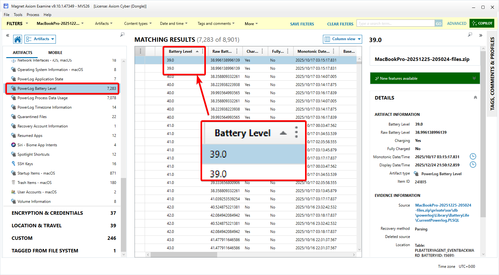 In Axiom Examine, under the "Operating System" and "Powerlog Battery Level" artifact filter, sort by "Battery Level" ascending. This data can be found in the filesystem at: