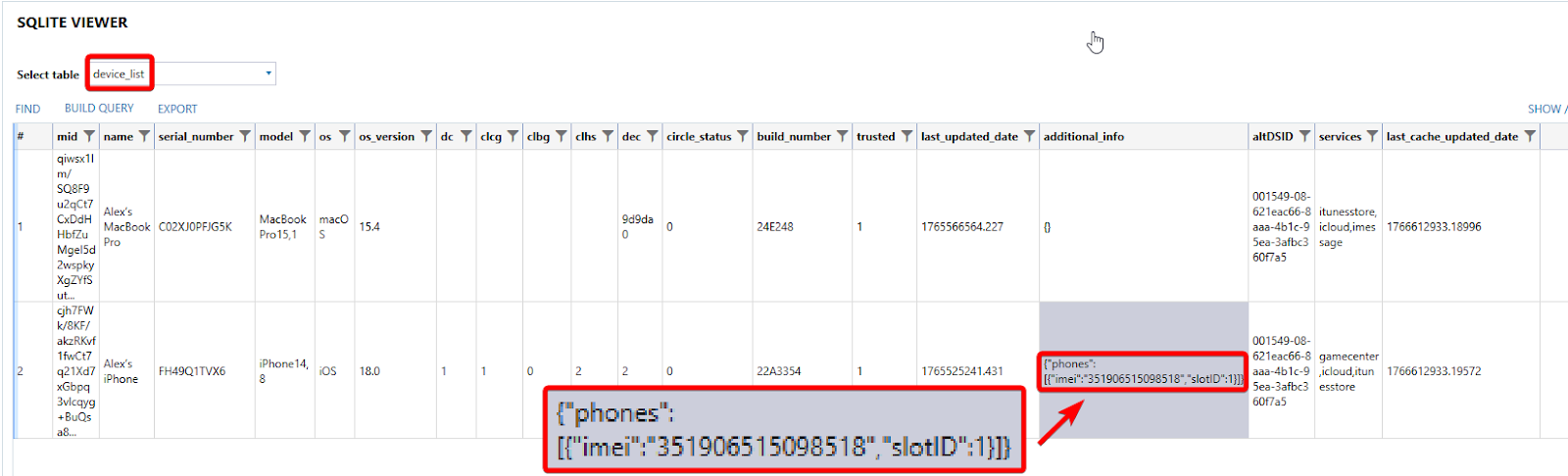 In Axiom Examine, navigate to \Users\alexmaurie\Library\Application Support\com.apple.akd\devicelist.db. Examine "additional_info" column within the "device_list" table the database.