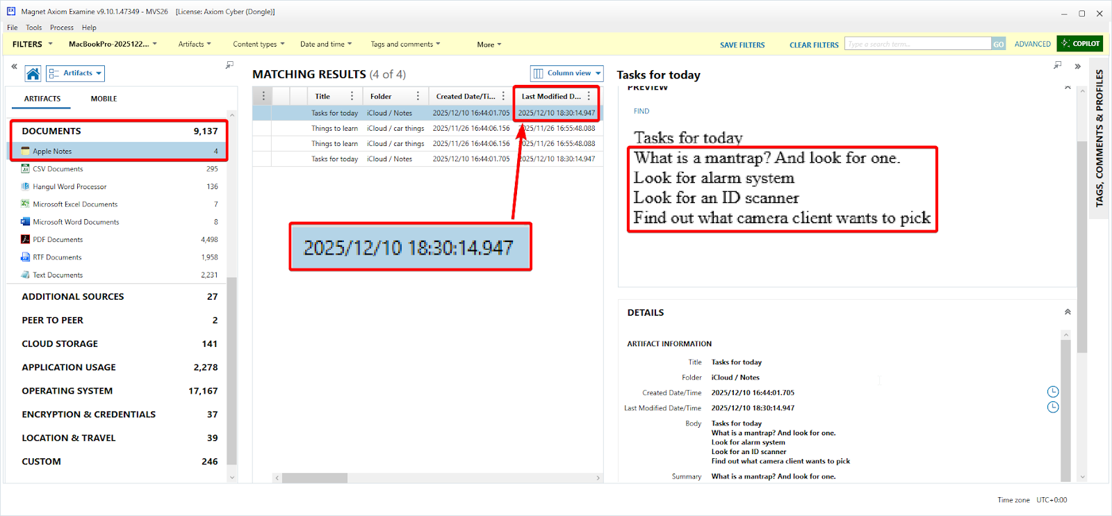 In Axiom Examine, parsed under the "Documents" and "Apple Notes" artifact filter is a user-written note containing a list of tasks that the user wants to do. The note is named "Tasks for today". You can view this raw data in the filesystem at: